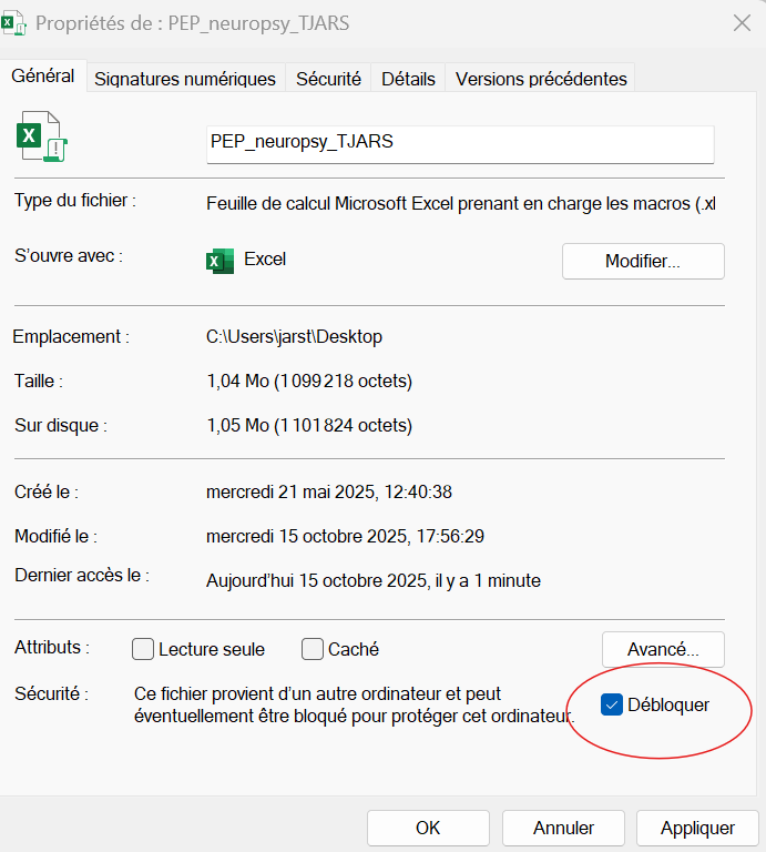 En bas de l’onglet Général, cochez la case Débloquer et sélectionnez OK.
